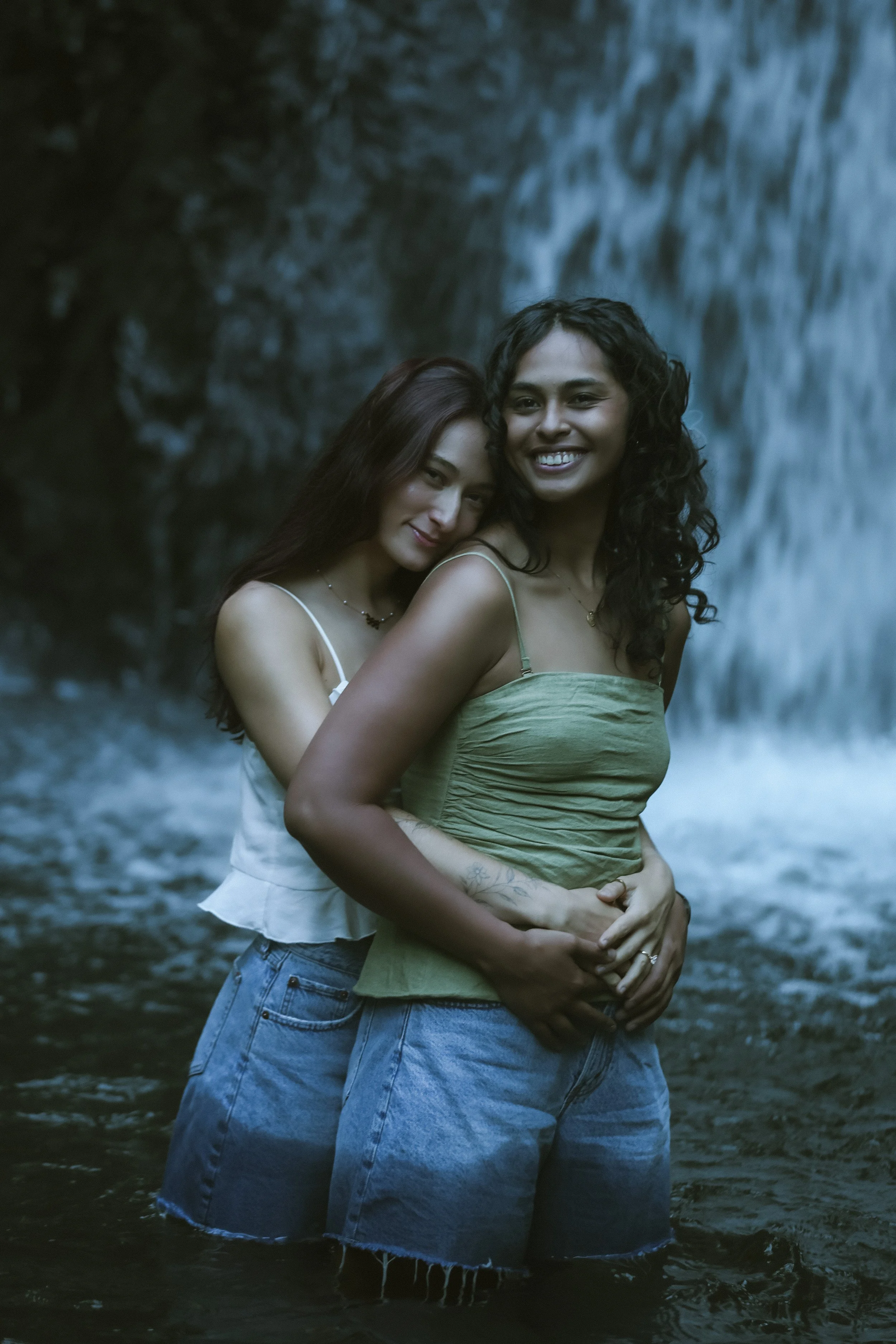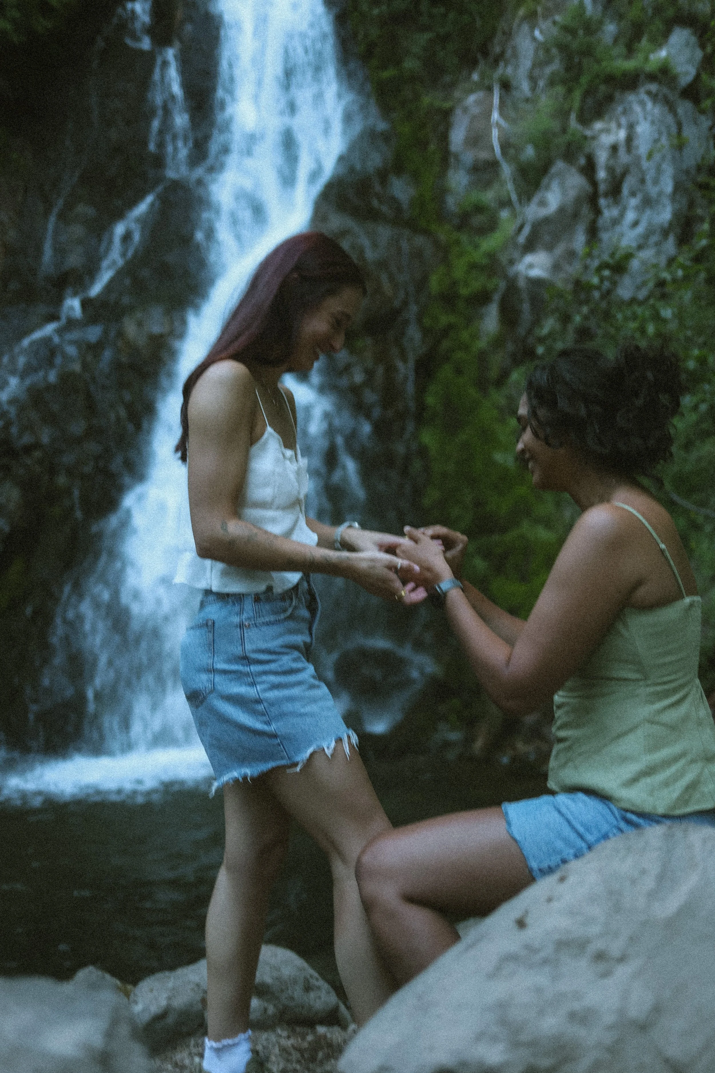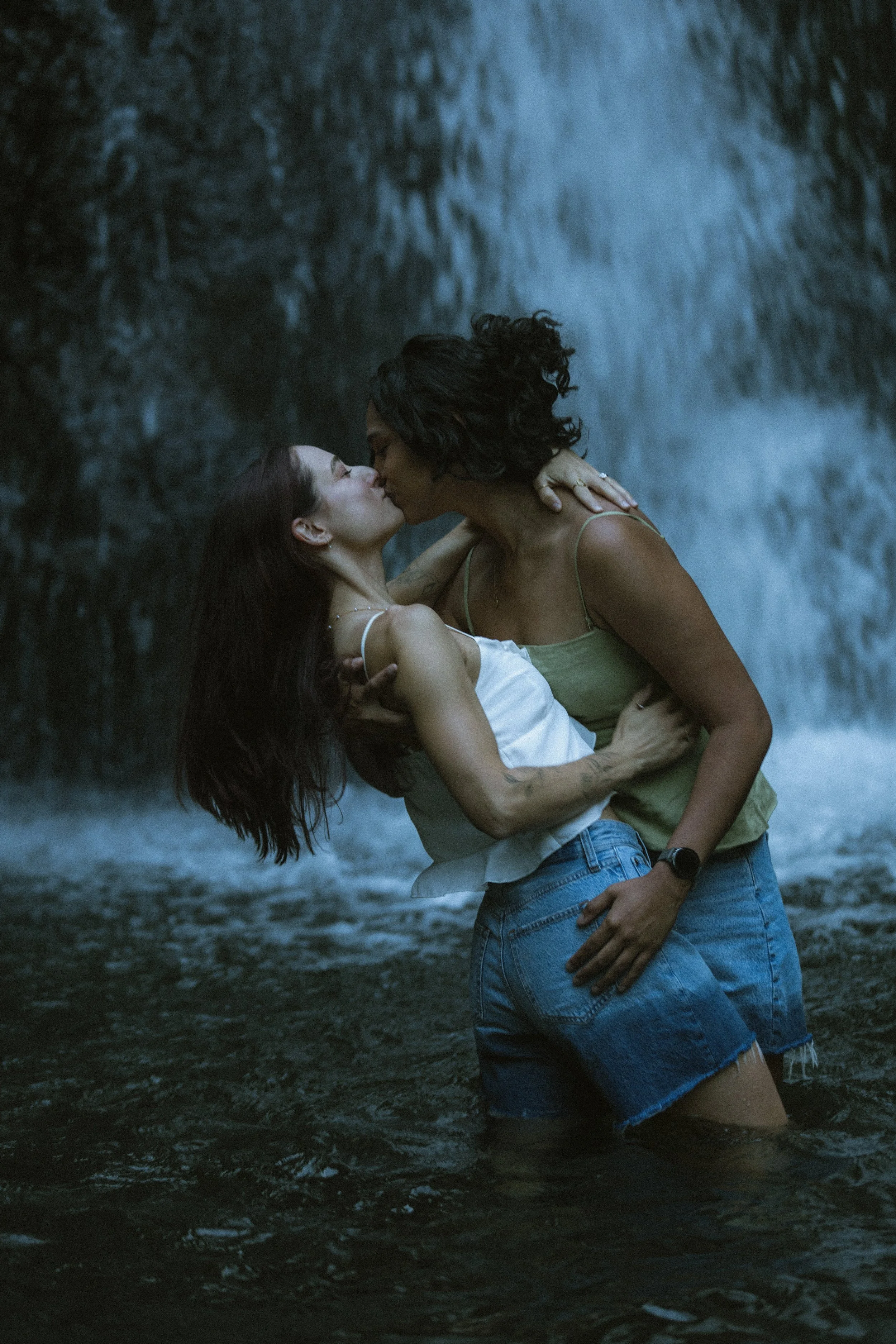 For this shoot, we chose a tucked-away waterfall near Mt. Hood. The falls tumble into a crystal-clear pool, surrounded by mossy rocks and ferns—it feels straight out of a fairytale. The sound of rushing water adds a peaceful, grounding element, and the mist keeps everything feeling cool and refreshing, even in the heat of summer.